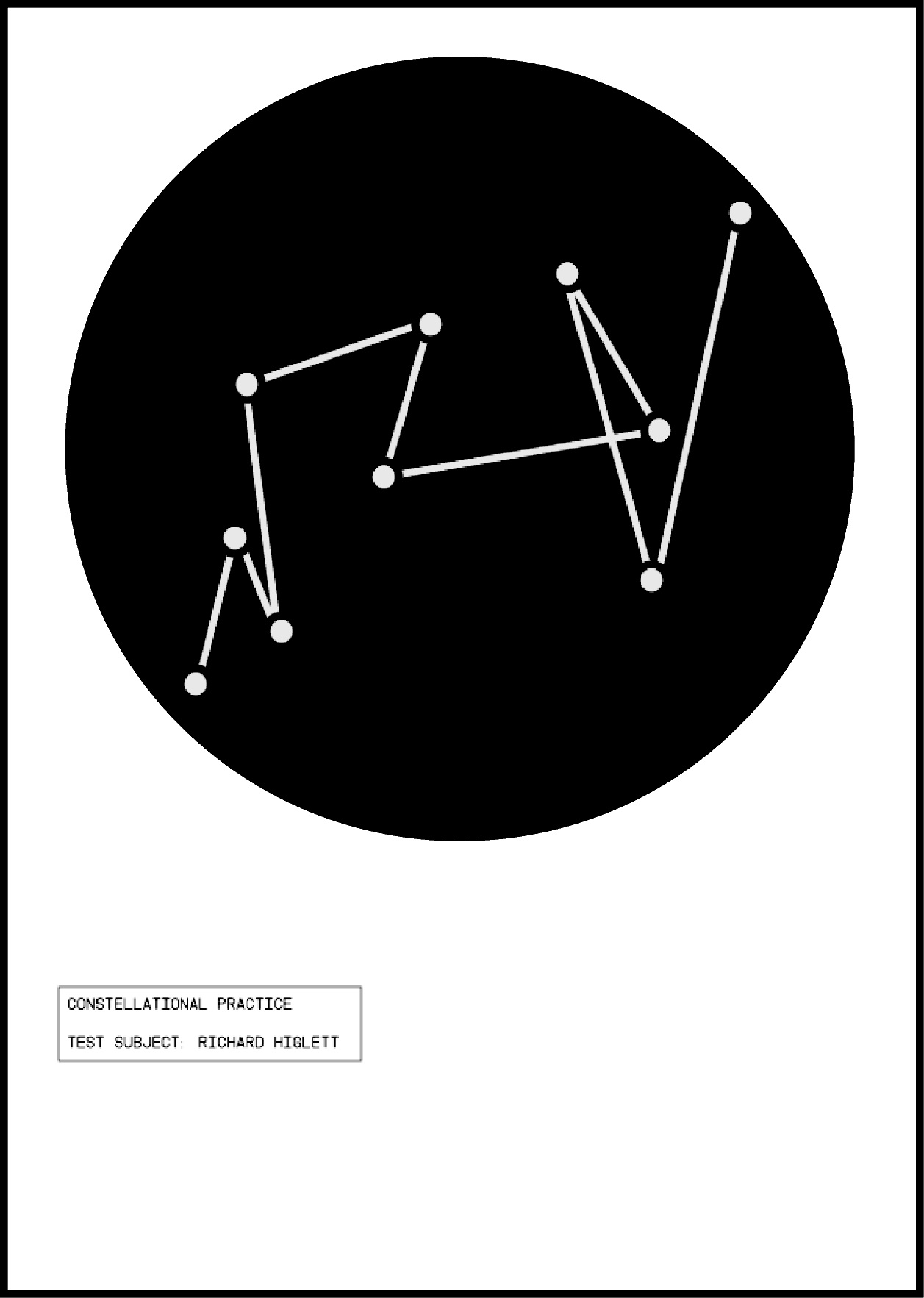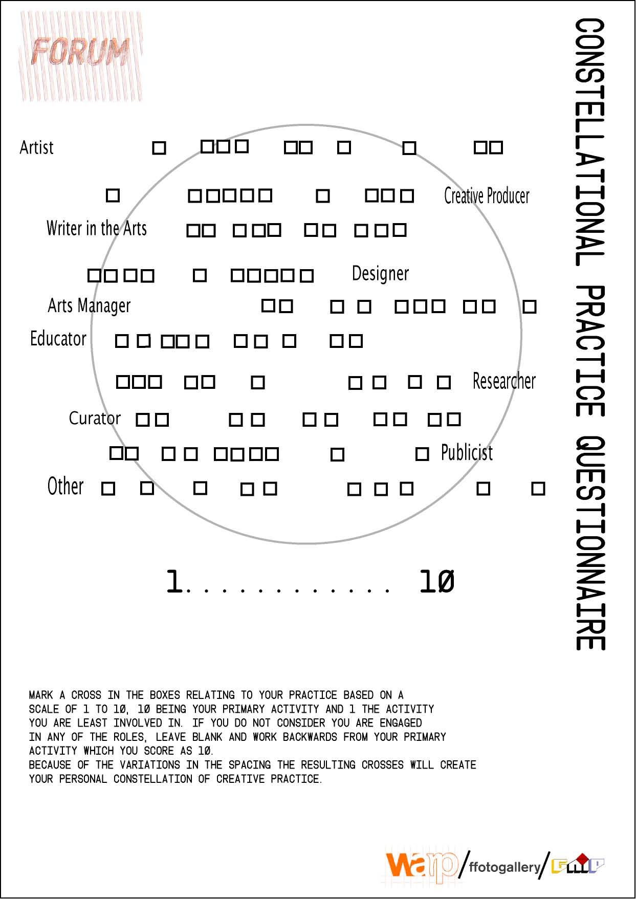 As part of research into the diverse roles artists are involved in creatively, I was asked to propose a framework for a FORUM event through WARP/g39. I had been looking at the idea of Constellational practice where the artist shifts from one role to another in the quest to present in the physical realm in some form. I devised a questionnaire with offset boxes which when completed created a pattern that suggested an individual star map of activity. For the FORUM event the questionnaires were cut into star map and applied to a black, empty circle on the GMP wall to build a relative universe of artist activity.
