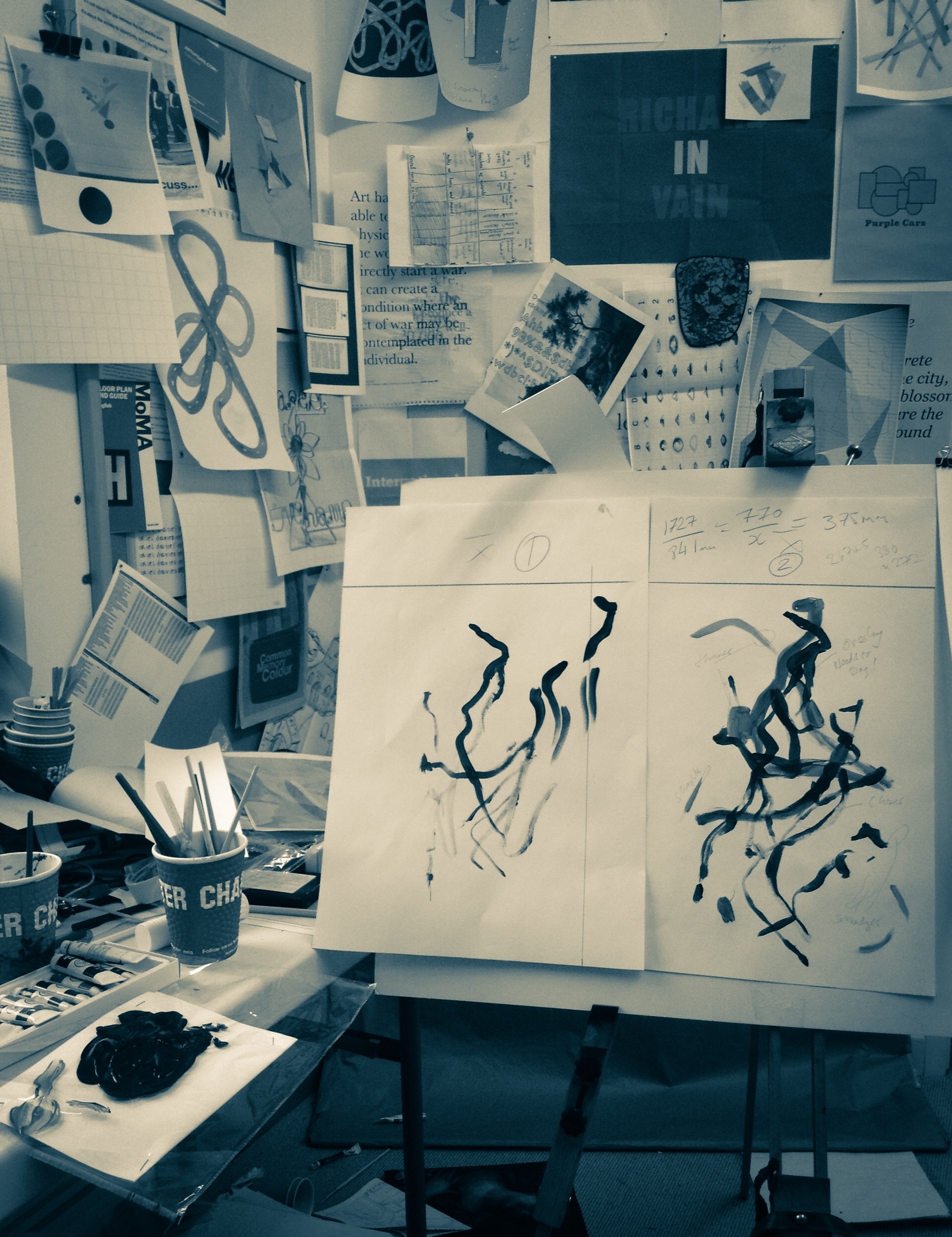 Currently working on a series of 6 copies of paintings made by elephants. Working with a ratio of paper size and average trunk length to my arm length the paper is reduced to my scale. The images are sourced on-line and subject to the discrepancies due to resolution as was a previous piece; Endless Kiss (2012) which was a recreation of an installation by El Lissizsky.