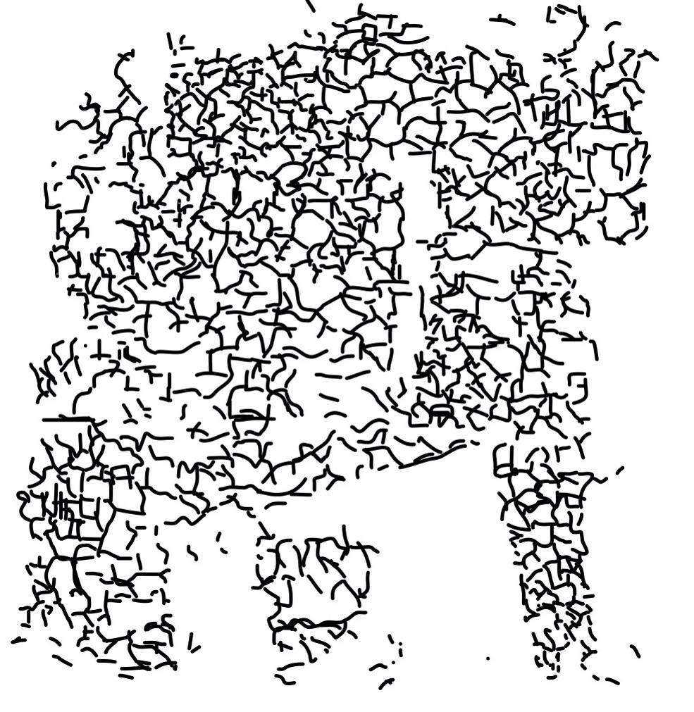 Painting equal in size to Malevich’s painting Black Square. Image is of black lines that if over laid on original work would cover the cracks in the original surface that have occurred over the past century. This image representing the restoration of the work to a solid black form.