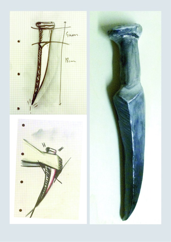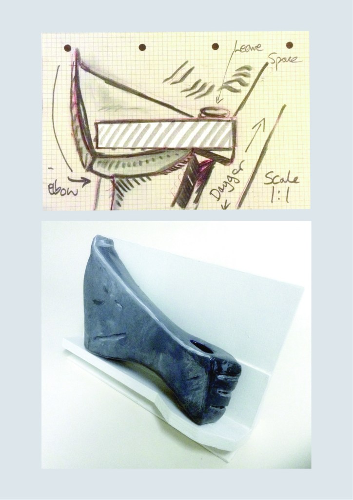 Abraham (3rd Attempt) is a recreation in clay of the arm, hand and dagger of Abraham 2, a stone sculpture of Jonah Jones from the collection of the National Museum of Wales, Cardiff. I was stuck by the violence and power of the gesture by Abraham in Jones’ work, as he holds a knife towards his son Issac as he looks to the heavens for a sign from God. It was God who has asked him to sacrifice his son to prove his loyalty. As a response, the dagger is removed from the hand and located out of reach as a gesture of peace and reminding us it is our individual decision to take up arms and resort to violence. The material used is intentionally breakable and fragile, as is the reality of peace. I was interested in the idea of physically changing the composition of the original work and how a narrative thread is drawn directly between the two works. Jonah Jones was a pacifist and I was interested in how this relates to his depictions of stories from the Old Testament as he attempted to understand the characters in the text, on a personal and emotive level while looking to develop a visual language seeking purity in form. The ‘3rd attempt’ relates to a continuation of numbering of Abraham 2 suggesting it is part of a series, while ‘attempt’ relates to whether the work and what is aspires to speak of, of Peace is something which can be seen as achievable .