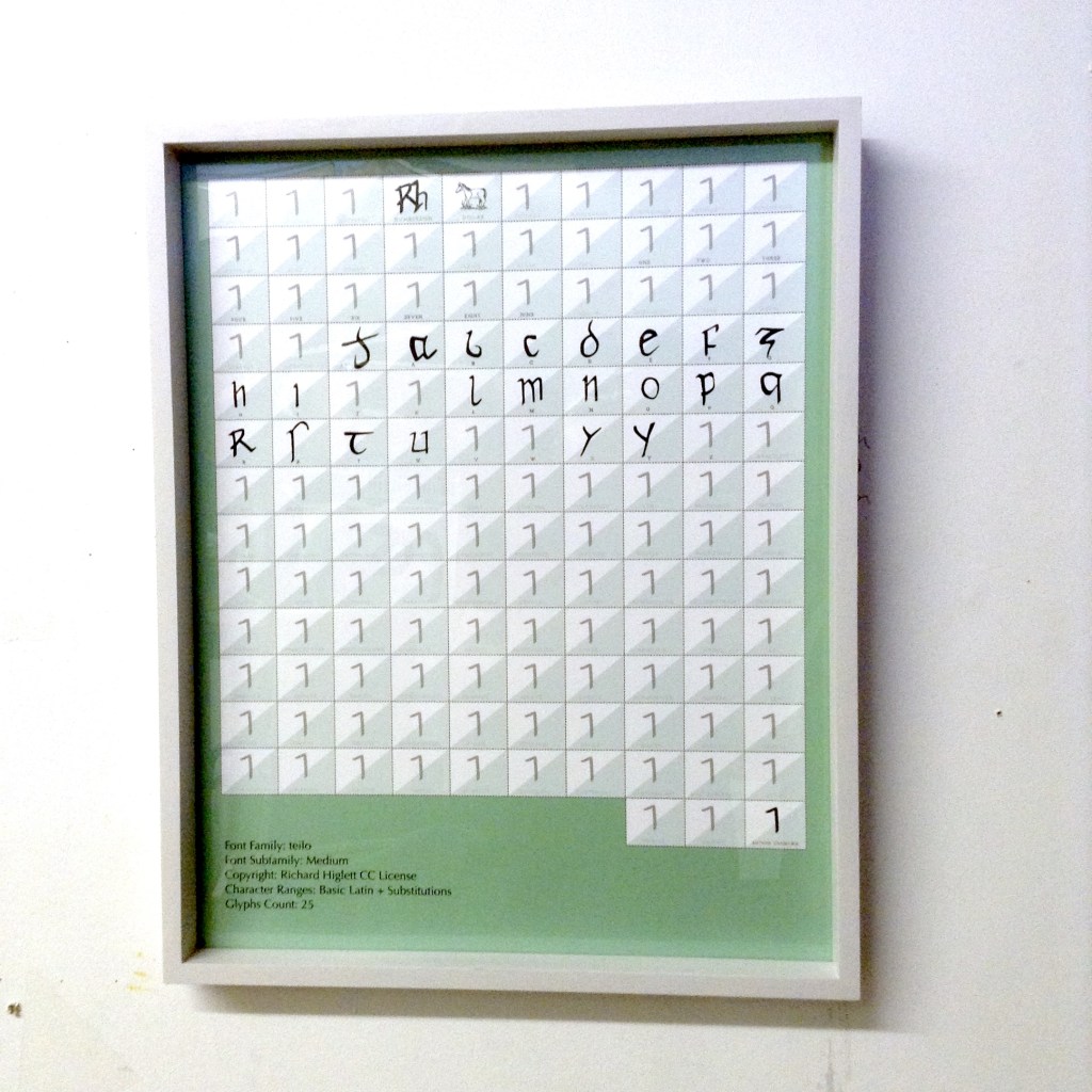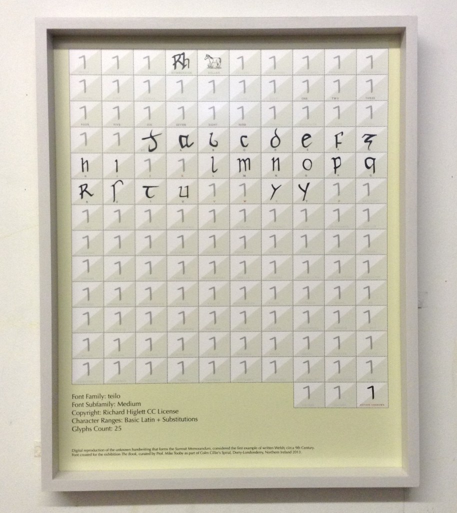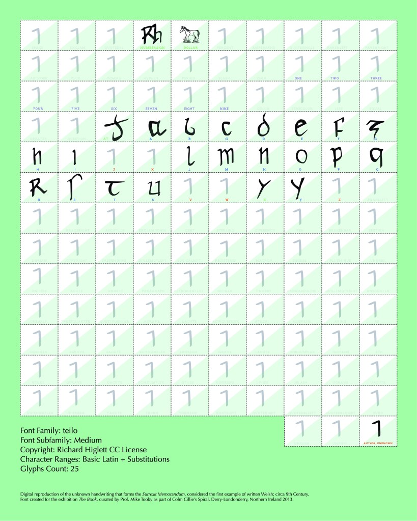 A series of 6 Glyph Maps will soon be available as editions, documenting bespoke typefaces created for installations and exhibitions since 2012. First map is teilo created for the exhibition The Book: Colm Cillie’s Spiral, London Gallery, Derry, Northern Ireland 2013. A digital recreation of the handwriting of an unknown cleric from the 8/9th Century. The text is known as The Surrexit Memorandum is considered to be the early known example of written Old Welsh.