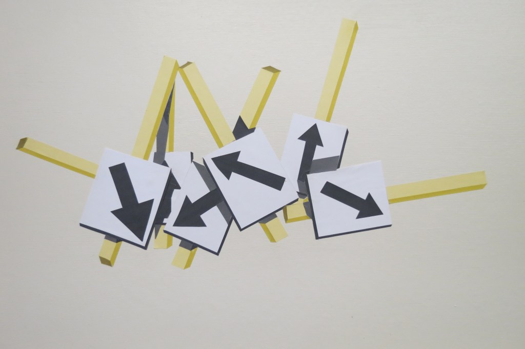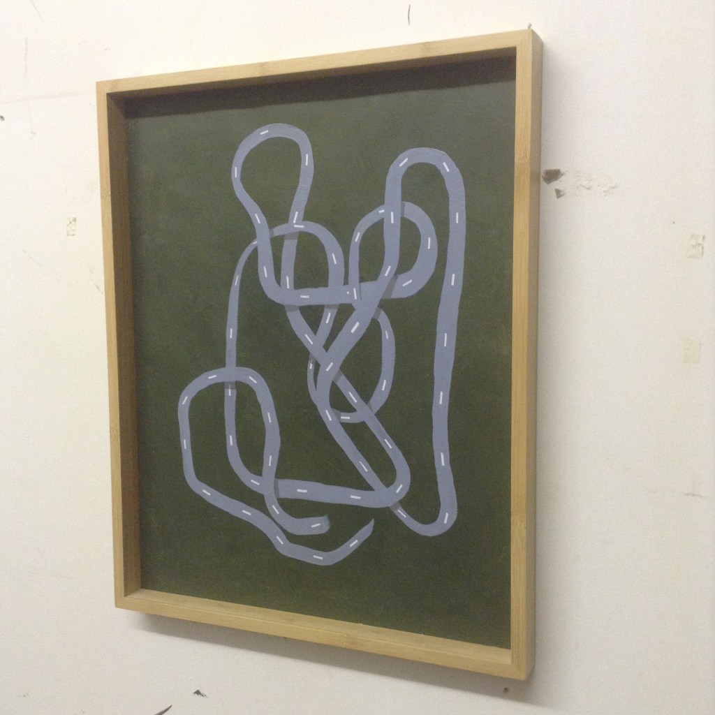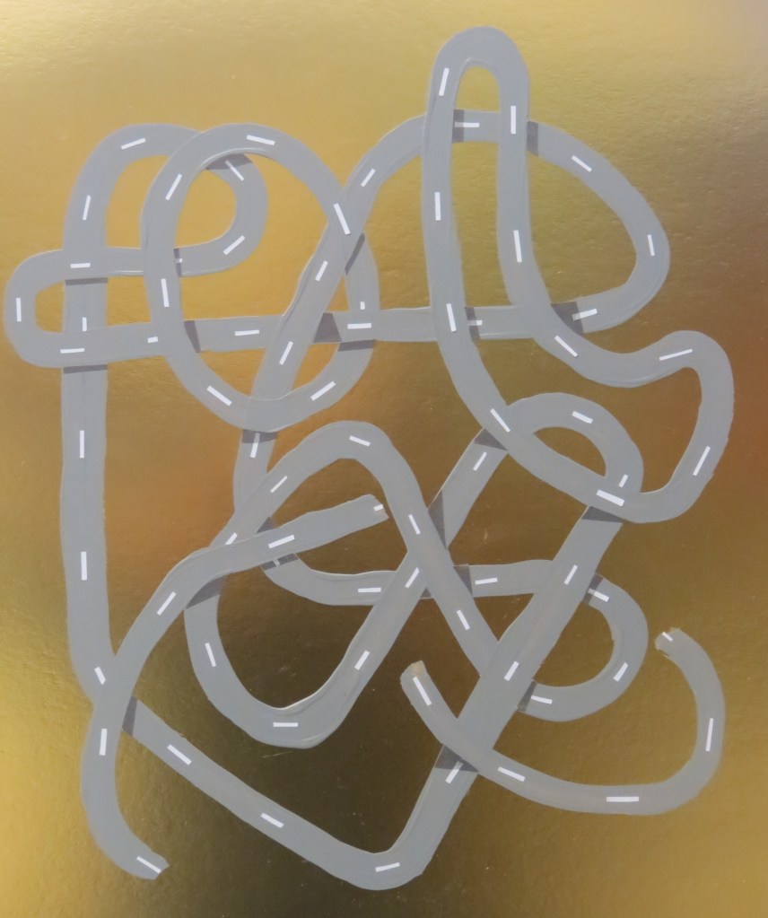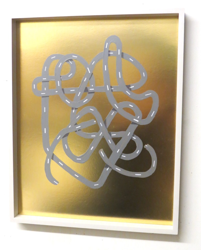reconstruction of piece made in Nantes in 2017 held on two screws. various movements: Tape and Paper collageModern Day ModernismA Wonderous Place: Oil on Paperback Novel.Genie: Acrylic on gold foil.the roads less travelled: acrylic on gold foil.the roads less travelled (Detail)Zero-Zero-One-Zero
